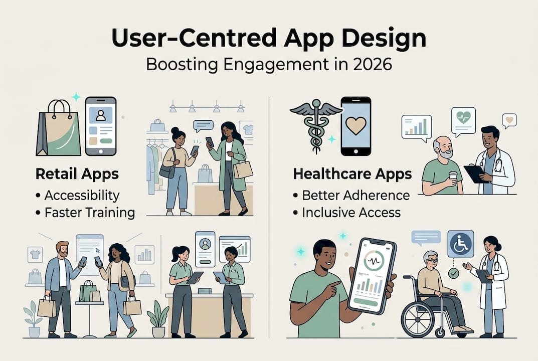 User-centred design means building applications around real user behaviours, limitations, and goals rather than developer assumptions or business preferences alone. This approach becomes especially critical in healthcare and retail where user diversity spans chronic disease patients with varying health statuses, employees managing disabilities, and customers with different technical abilities. User-centred design improves engagement and adherence in healthcare apps by tailoring interfaces to these diverse needs.